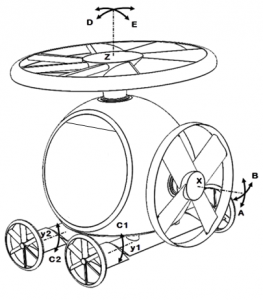 The landing wheels have elastomeric fan blades as spokes to absorb a 5G landing impact. Between the wheels and the fixed wings, four flaps assist in aircraft attitude and flight control, including hovering for counter-torque by opposing angles at left and right. The wheel rotors counter the lift-rotor’s torque exerted on the fuselage as well. The noise-to-ground is limited by very low rotor speeds of long-chord thin-airfoil rotor-blades (e.g., NACA 7501 on the lift-rotor).